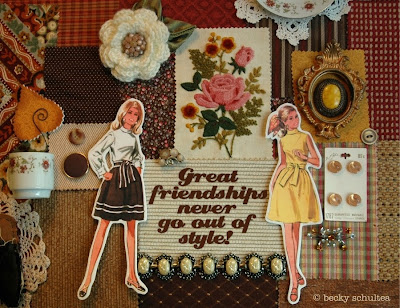 I've been playing around in the studio this week, combining my love of vintage fabrics, china, linens, jewelry, buttons, trims, and trinkets with retro images from my collection of vintage sewing patterns. It's kind of a cross between an inspiration board and an illustration. I have lots of tweaking yet to do, but I am having fun. This is the beginning of the new work I was talking about in a previous post...
